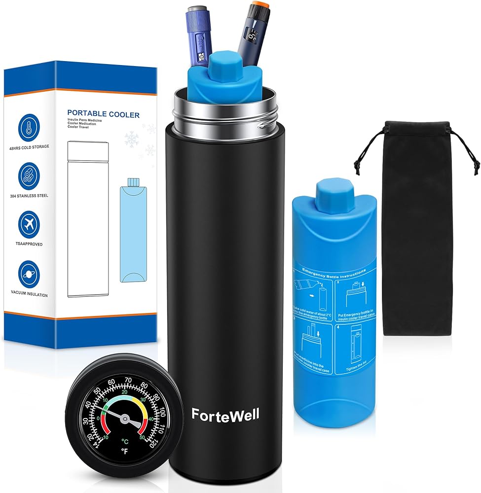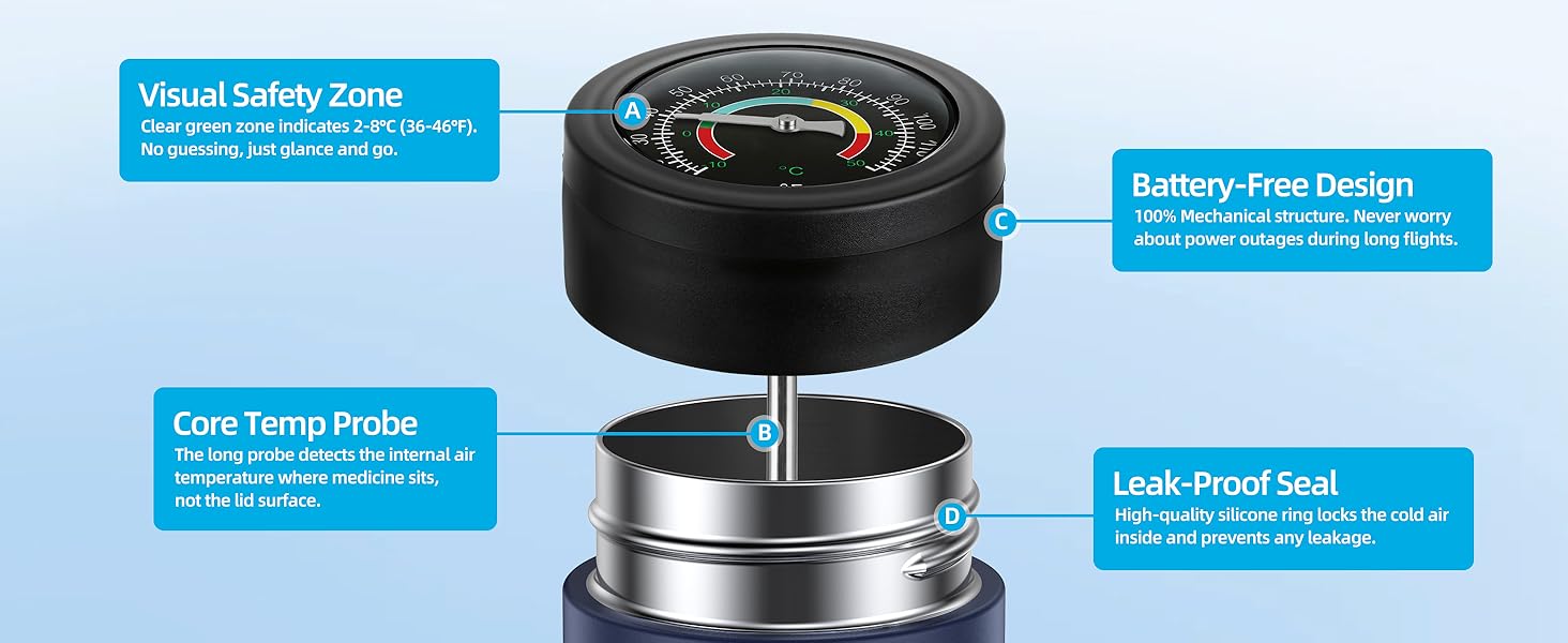 【Real-Time Temperature Control】 Stay confident on every trip. Our insulin cooler features a built-in top-view temperature indicator, allowing you to monitor internal temperature at any time. Maintains safe cooling for up to 60 hours when used with the Cold Gel Bottle and emergency bottle.