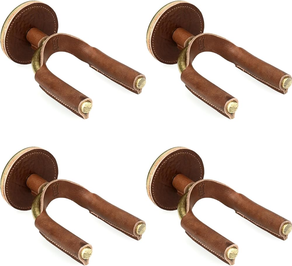 Introducing the Levy's FGHNGR Brass Forged Guitar Hanger (4-pack): a perfect blend of style and functionality designed for the modern musician. Mount your cherished guitars and basses securely on the wall, thanks to its robust steel yoke elegantly wrapped in handcrafted stitched leather. This hanger effortlessly accommodates headstocks of different shapes with its versatile swivel design, ensuring maximum support and protection for your prized instruments. The inclusion of a complete mounting kit, including screws, makes installation a breeze, so you're ready to show off your collection in no time. Levy's Leathers, originating from Nova Scotia in 1973, has cemented its reputation as a top tier accessory brand known for premium guitar straps adored by countless artists. Elevate your musical space and shop with confidence knowing industry giants trust Levy's. Enhance your home or studio setup with the distinguished Levy's FGHNGR Brass Forged Guitar Hanger, where form meets functionality in unmatched style.