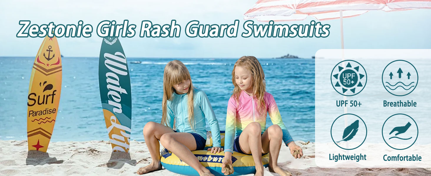 »»»» ENJOY HAPPY SUMMER NOW «««« All our pursue is to make your girls satisfied with girls rash guard swimsuits collections. No harsh UV rays and bleached suits any more. Feel free to reach us for caring customer service whenever there is any problem.