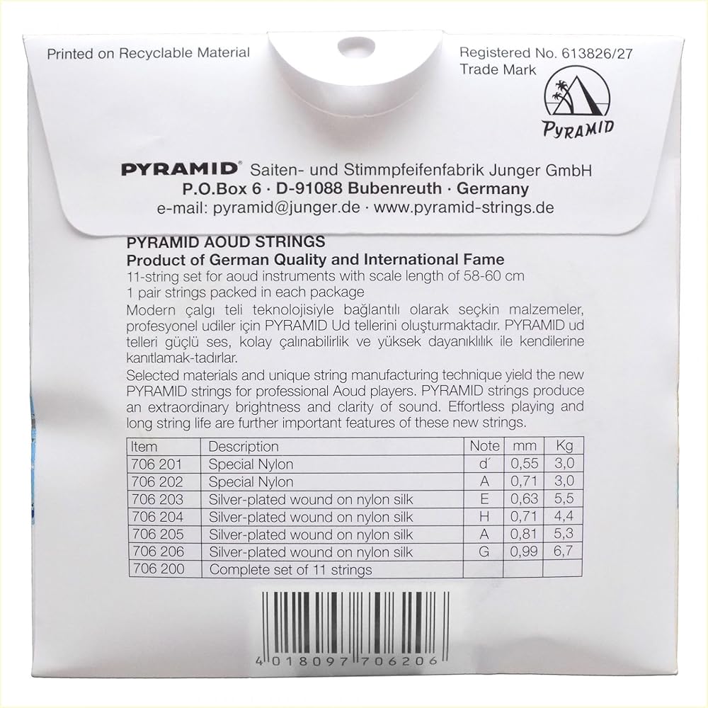 Set / Turkish Oud 11-string d'd' aa ee HH AA GScale length: 60 - 62 cm1. D 0,55 mm (2x) - Special Nylon2. A 0,63 mm (2x) - Special Nylon3. E 0,62 mm (2x) - Silver-plated wound on Nylon silk4. H(B) 0,71 mm (2x) - Silver-plated wound on Nylon silk5. A 0,81 mm (2x) - Silver-plated wound on Nylon silk6. G 0,99 mm (1x) - Silver-plated wound on Nylon silkEach course (double string) comes in a string bag.Set of 11 strings in standard tuning. Made from finest materials. The strings produce aclear and brilliant tone and have great tuning stability.