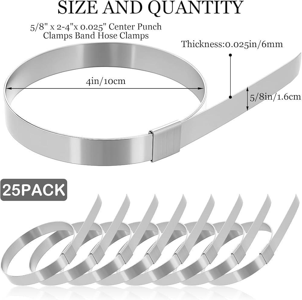 • Product Includes: This hose clamps stainless steel package contains 25 center stamped hose clamps, 5/8" wide x 0.025" thick x 4" diameter, providing ample supplies for your daily needs