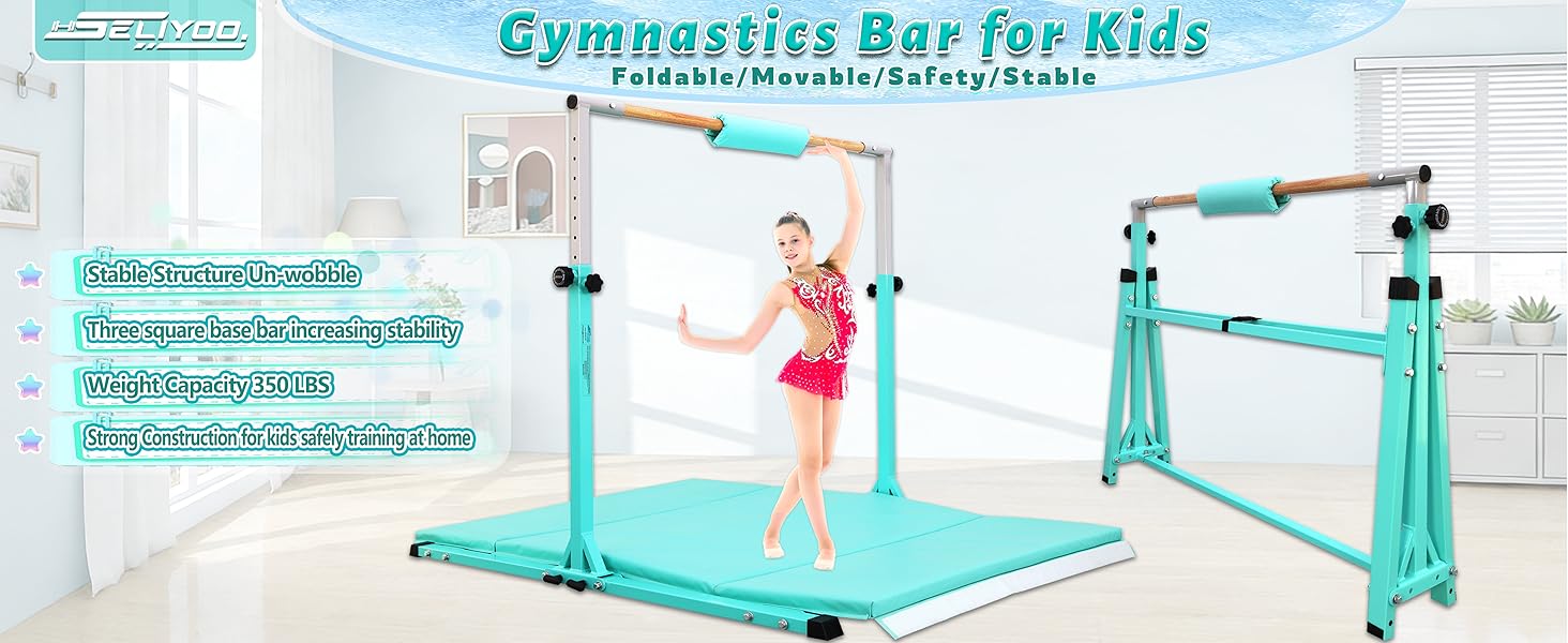 rofessional Kids Gymnastics Bar for Safe Training – This foldable gymnastics bar features a heavy-duty steel frame (OD 30mm×50mm, thickness 2mm) and smooth fiberglass crossbar, supporting up to 400 lbs—safety kids gymnastics equipment. Three square pipe base connections enhance stability, letting kids practice with confidence, ideal for home use