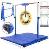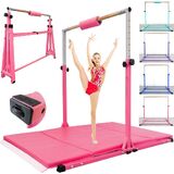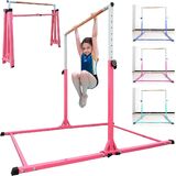 1.Foldable in Seconds We design the gymnastics bar can be fold in seconds,just pull out the base middle big screw with handle,then you can fold it up in seconds to save space. 2.360° Moving wheels We choose more bigger wheels on the bottom of kids gymnastics equipment bars,so after fold up you can move it around on floor or on the path after many times test. 3.Main size of the bar--gymnastics Height: There are 12 height options to choose from 3' to 5',so the gymnastic bar can grow up with your kids together.and it is perfect for kids training at home gymnastics bar at age 8-12. 4.Base Length: The base length of gymnastics bar is 5 FT, that is quite stable for starters or skilled training on it.we can support 350 LBS hanging on it. 5.Width: The width is 4FT,Support most folding mats put under the bar (The package do not include gymnastic mat) 4.Fiberglass bar Compared with wood barre that after sometime usage may be bend and need to change a new one,we use more safe and flexible fiberglass bar.You do not need to change a new cross bar after long time usage,this is perfect for kids gymnastics equipment.