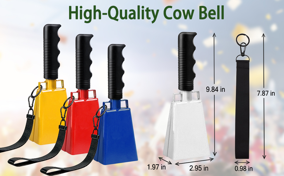 【Hands-Free Wrist Strap 】Each cow bell comes with a 9.4-inch soft nylon wrist strap, making it easy to carry and safe to use. You won't have to worry about losing the bell while swinging it, ideal for marathons, outdoor festivals, and all-day sports events.