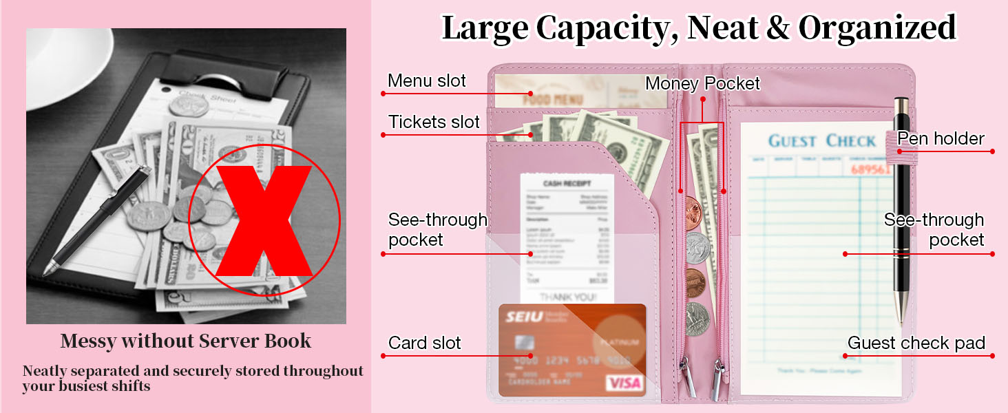 Presenter & Organizer: The money book organizer is great to keep credit cards, business cards, cash, coins, bill, check, tip and receipts in order. The serving book for waitresses has a firm writing surface for order taking, and also features a pen holder on the side instead of in the middle, making it easier to access. It completely liberates your hands and saves you more space.