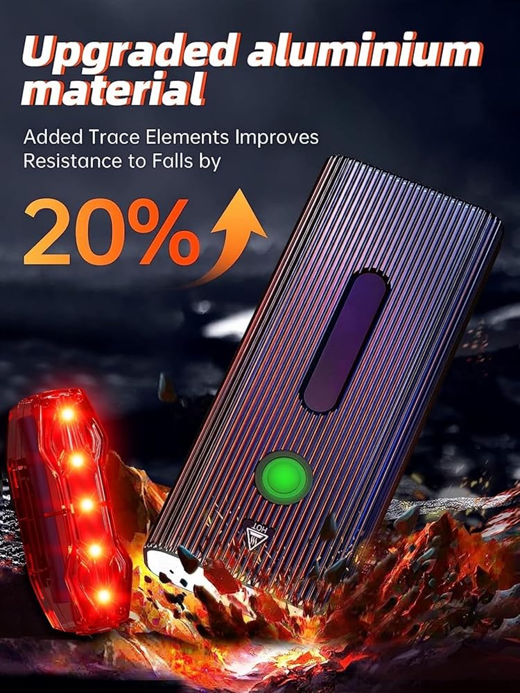 Aluminum Alloy Construction: Crafted with a premium aluminum alloy casing, the LED bike light offers outstanding impact resistance, shatterproof performance and pressure resistance. It handles bumpy roads and accidental knocks with ease, making it perfectly suited for rugged outdoor riding conditions.
