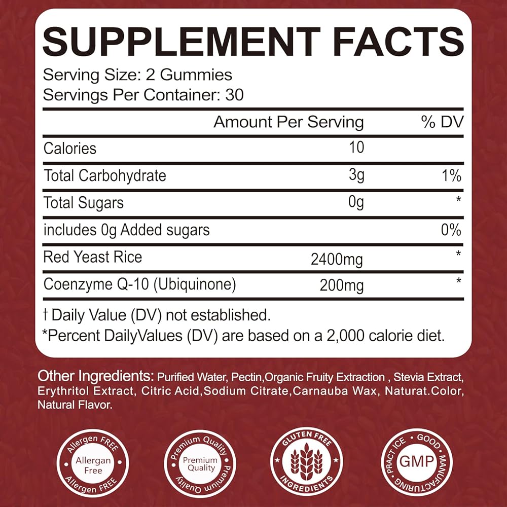【Carefully Crafted Combination Formula for Enhanced Absorption】: Each serving of two gummies delivers 2400mg of red yeast rice and 200mg of CoQ10. This strategic combination is designed to provide comprehensive support for your cardiovascular system and overall health. Our formula utilizes highly bioavailable ingredients to ensure your body can fully utilize these potent compounds.
