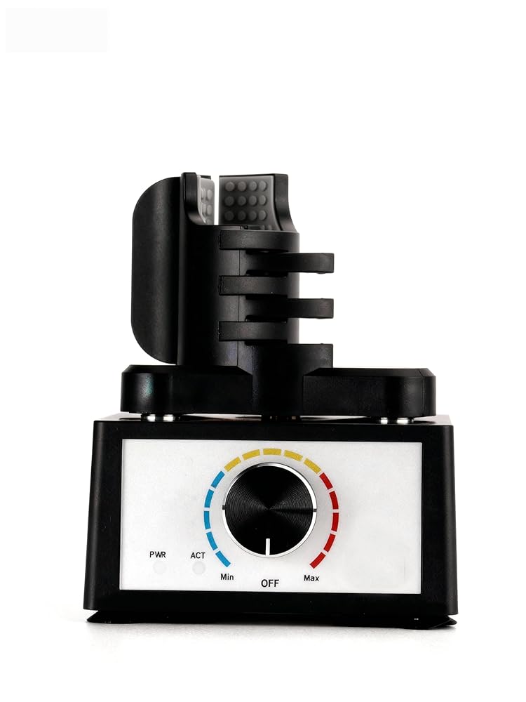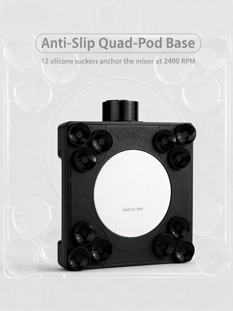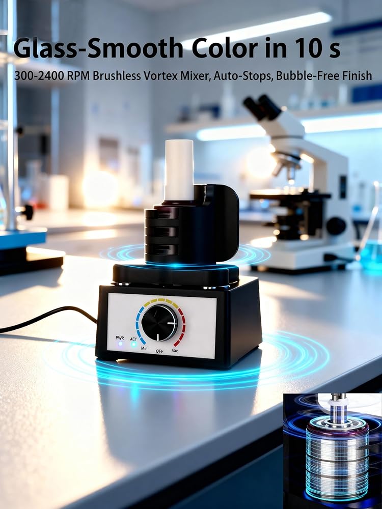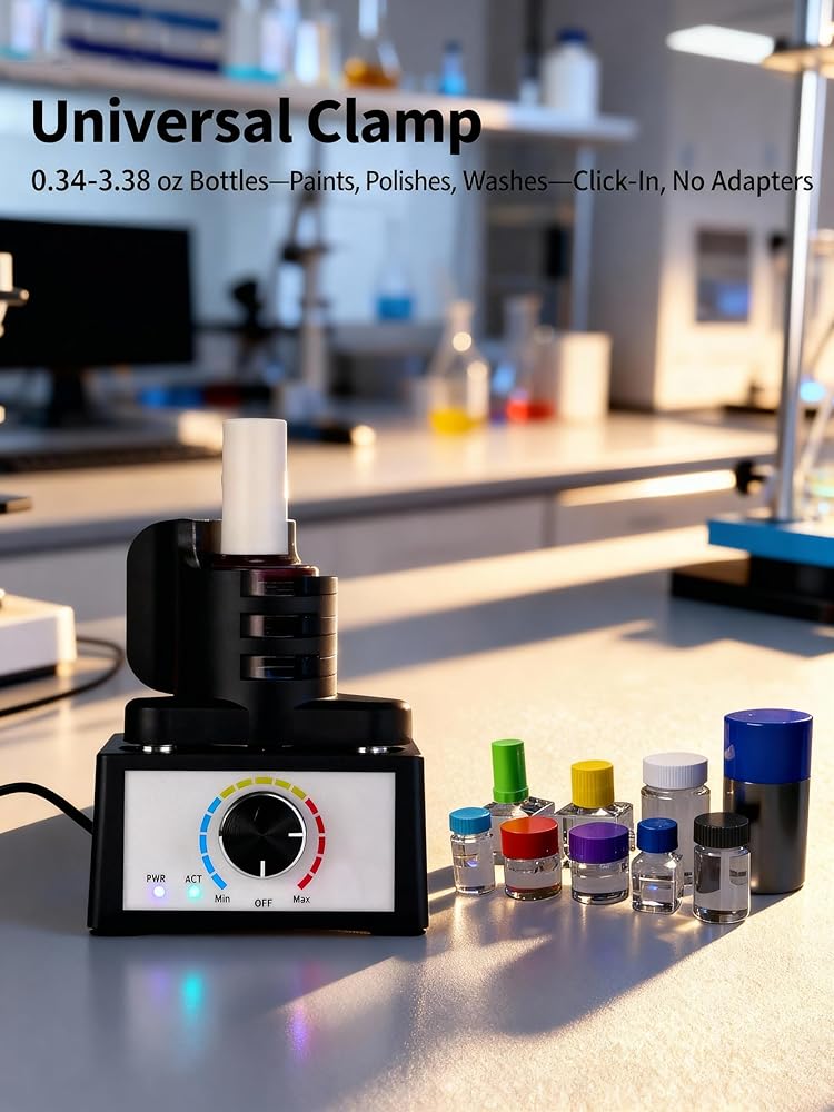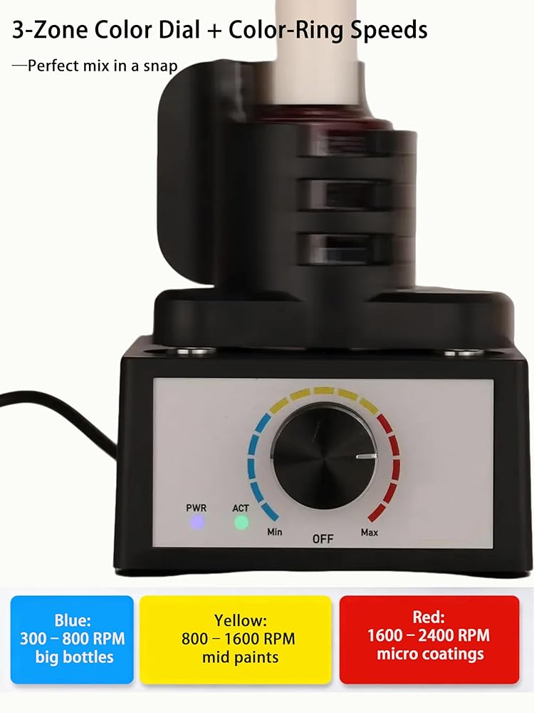 Achieve glass-smooth color in seconds—this palm-sized paint vortex mixer clamps 0.34-3.38 oz/10-100 ml bottles up to 8 cm/3.15 in and spins them at 300-2400 RPM in ≤10 s, auto-stopping after 2 minutes. Dial the color-coded ring: blue (300-800 RPM) for 1.35-1.69 oz/40-50 ml base coats or 3.38 oz/100 ml spray cans, yellow (800-1600 RPM) for 0.34-1.01 oz/10-30 ml acrylics, red (1600-2400 RPM) for ≤0.34 oz/≤10 ml ceramic inks. Four corner pods with 3 silicone suction cups each lock the brushless unit to the bench, cutting vibration and noise. Hands-free start frees both hands; after 5 back-to-back cycles, give the motor a 10 min break. Mix model paints, gel polishes, lash adhesive or lab solutions anywhere—flawless results every time.