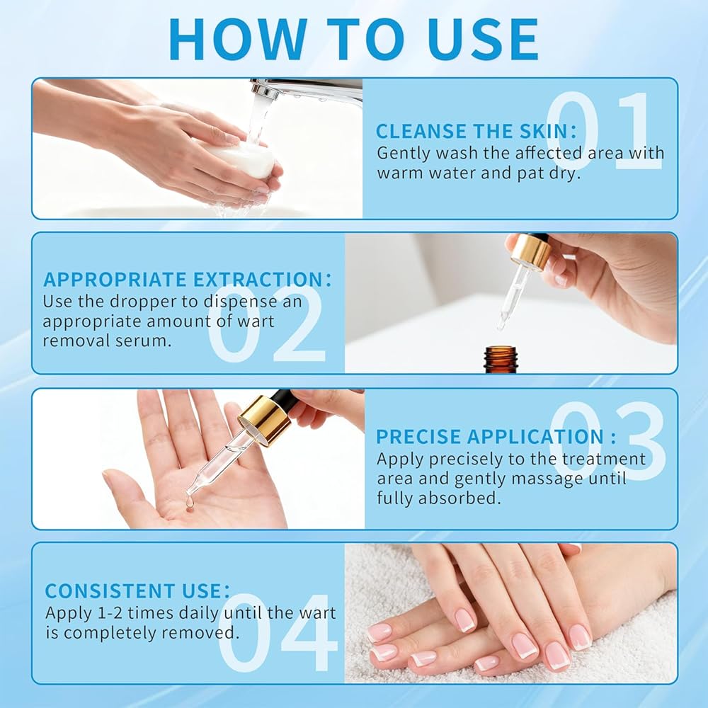 Simple & Refreshing Application:After cleansing and drying, apply a small amount to the affected area and gently massage until absorbed. The lightweight formula feels refreshing without stickiness. Its convenient application seamlessly integrates into your daily skincare routine—use morning and night for consistent results and say goodbye to warts