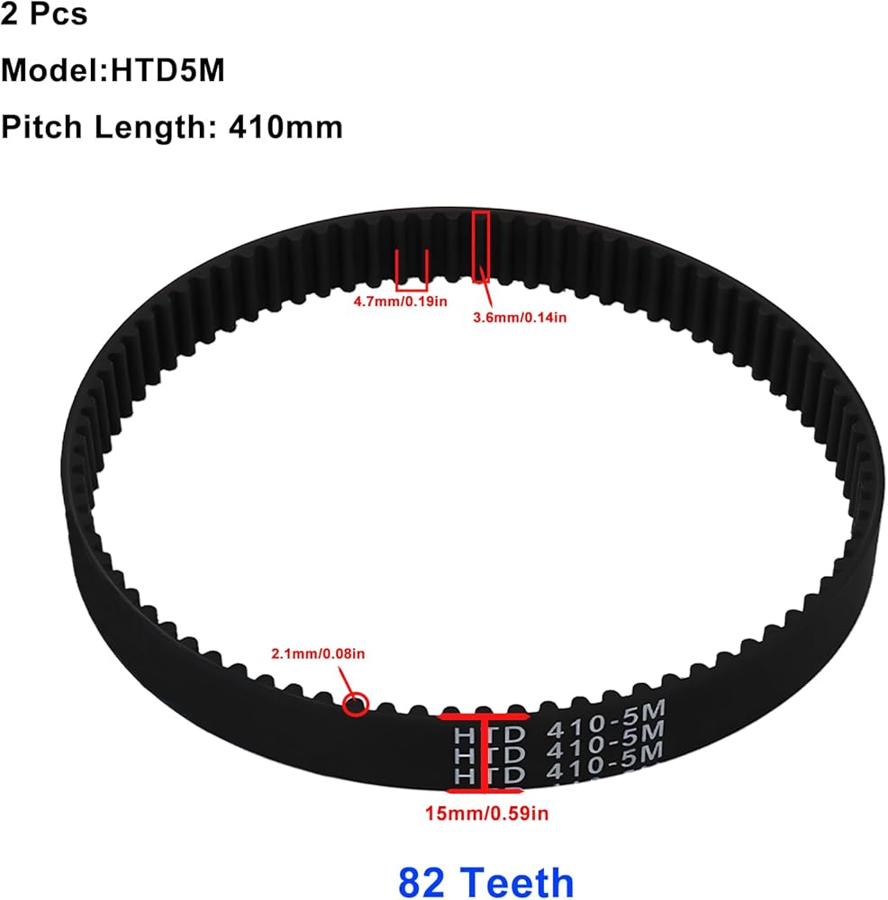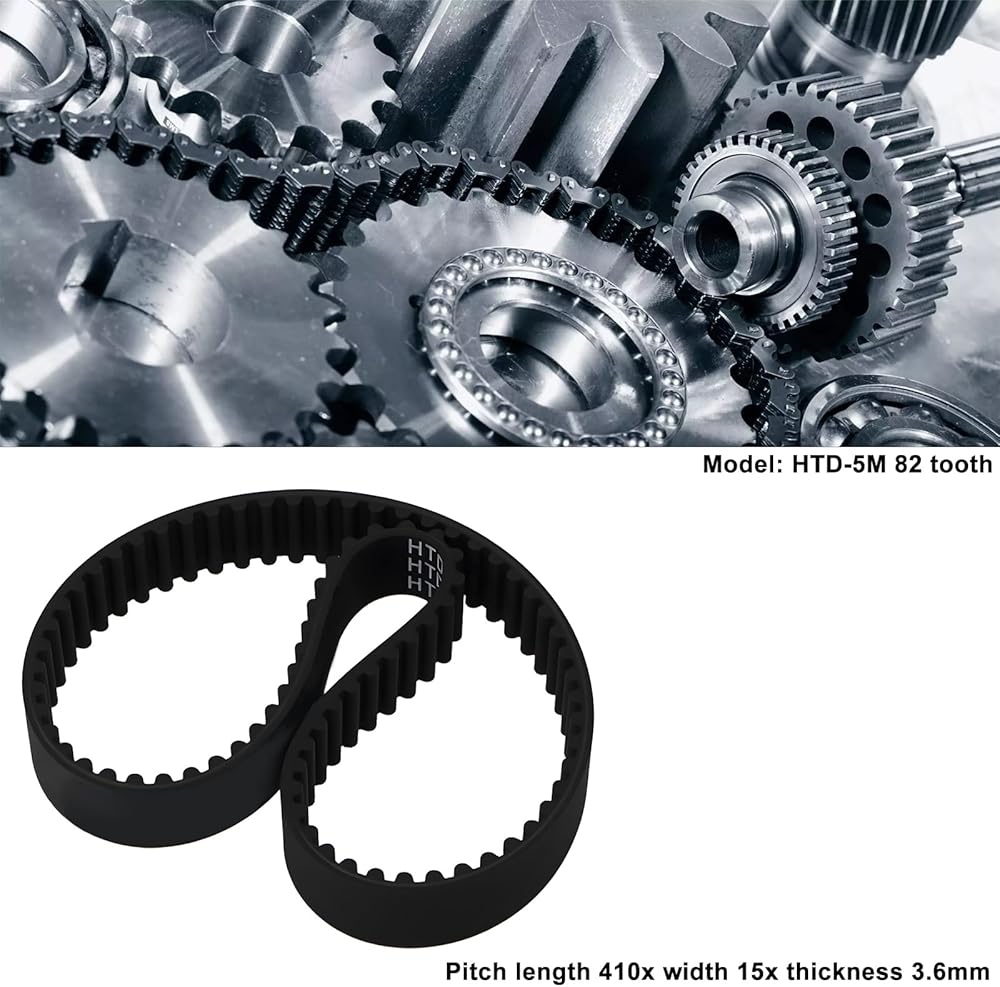 Size: HTD5M (High Torque Drive) timing belt with 410mm Pitch Length, 15mm Width, 3.6mm height. Curved shape for better power transmission and reduces the risk of slippage.