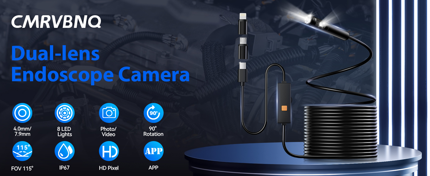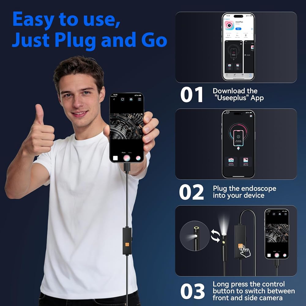 【Dual-Lens with 1920P HD Resolution】This borescope camera Equips with dual high-resolution camera. Switch between front and side cameras with a single tap for a complete 1920P HD view. The 2.0MP HD endoscope can Capture clear photos and videos to thoroughly examine hard-to reach areas like engines, pipes, and walls from multiple angles