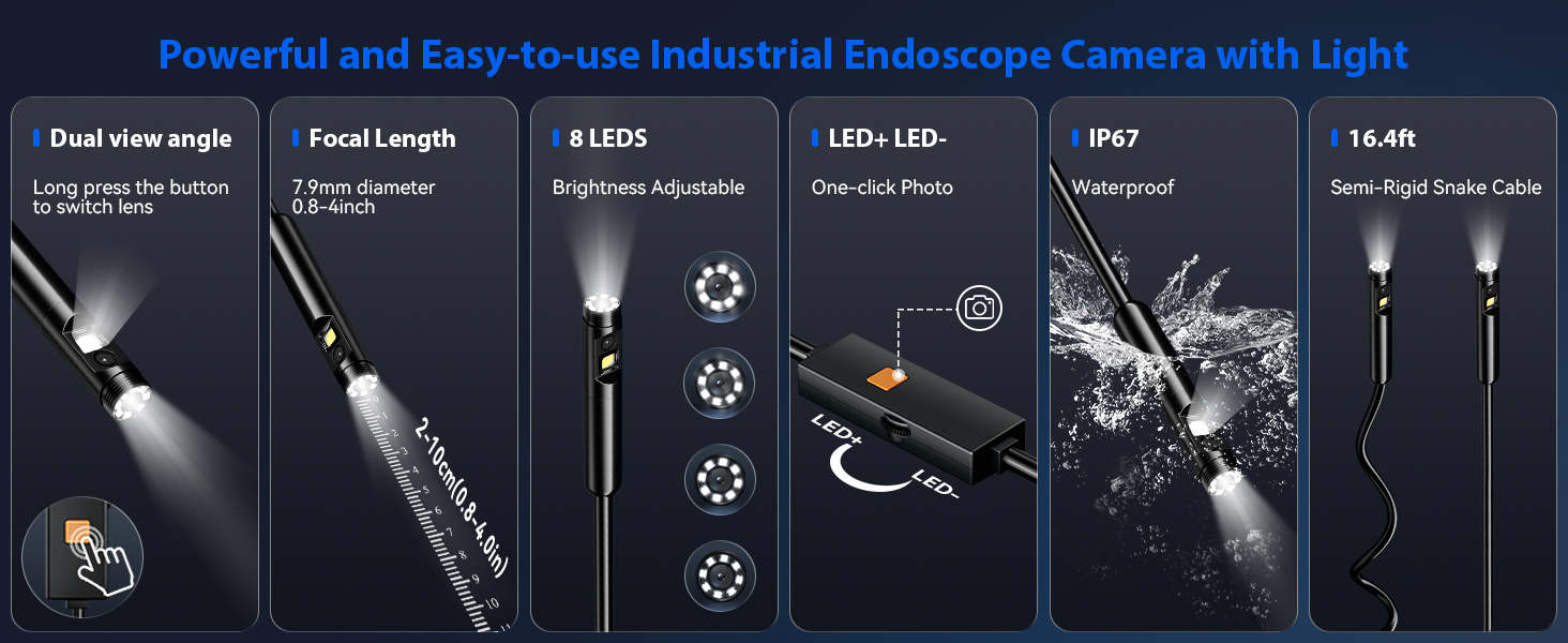 【Semi-Rigid Cable & Waterproof Probe】The 16.4-foot semi-rigid snake cable which provides good flexibility and rigidity, holds its shape to navigate deep into machinery and complex pathways. This endoscope with an IP67 waterproof rating can operate underwater up to 3.28 feet for 1 hour, it's perfect for use in damp, wet, or messy conditions