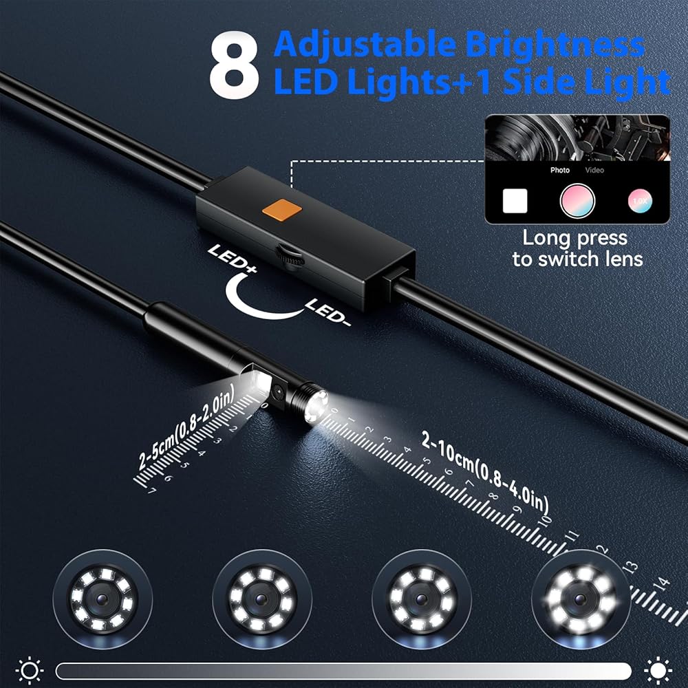 【8+1 Adjustable LED Lights】The borescope features 8 bright LEDs and an additional side light with adjustable brightness levels for optimal illumination, See every detail clearly even in dark, dusty, or oily environments