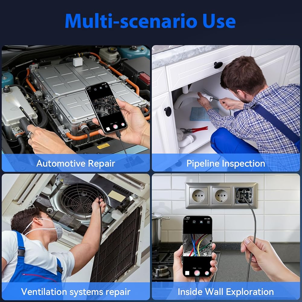 【Wide Application】This endoscope camera with light is a versatile inspection tool essential across numerous fields. It allows mechanics to inspect internal engine components, enables plumbers to view inside pipes, and helps HVAC technicians examine ductwork. The borescope is vital for diagnosing issues without disassembly, saving time, costs and widely used in car repair, home inspections and industrial maintenance