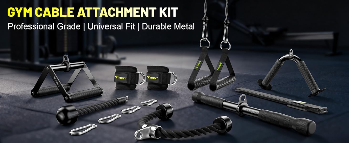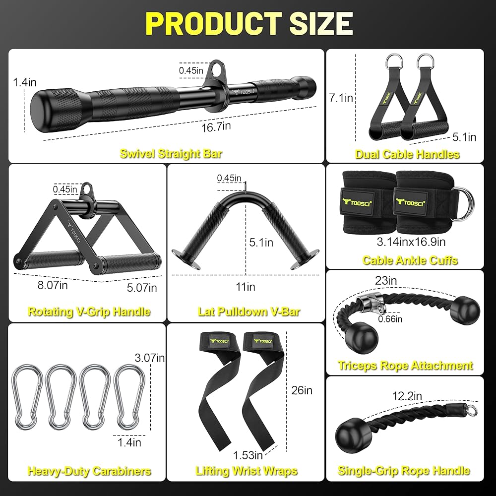 Complete Cable Machine Attachment Set (Package Includes) — One V-shaped bar, one rotating straight bar, one rotating V handle, one nylon braided tricep rope, two ankle straps, two cable machine handles, four snap hooks, two lifting wrist straps, and one single-grip rope handle. Designed as cable attachments for gym and lat pulldown attachments for home gym cable systems.