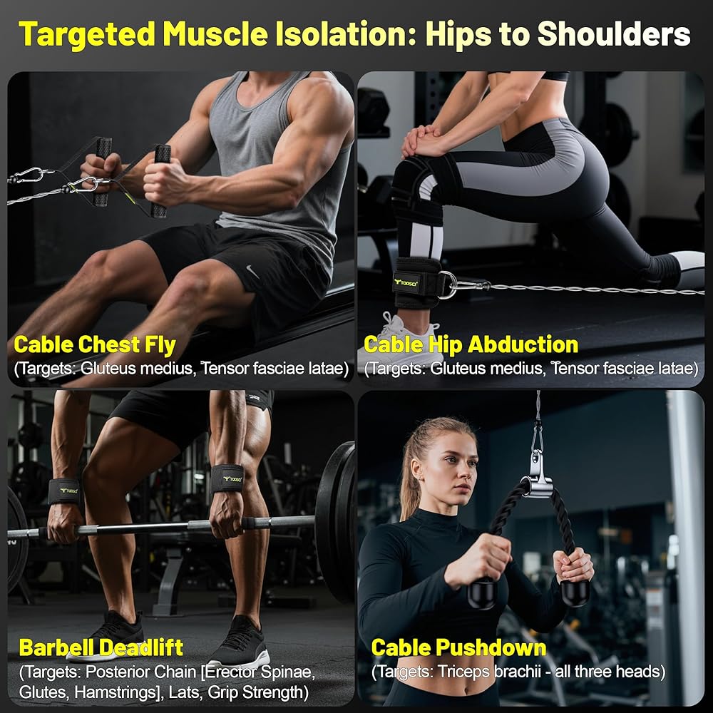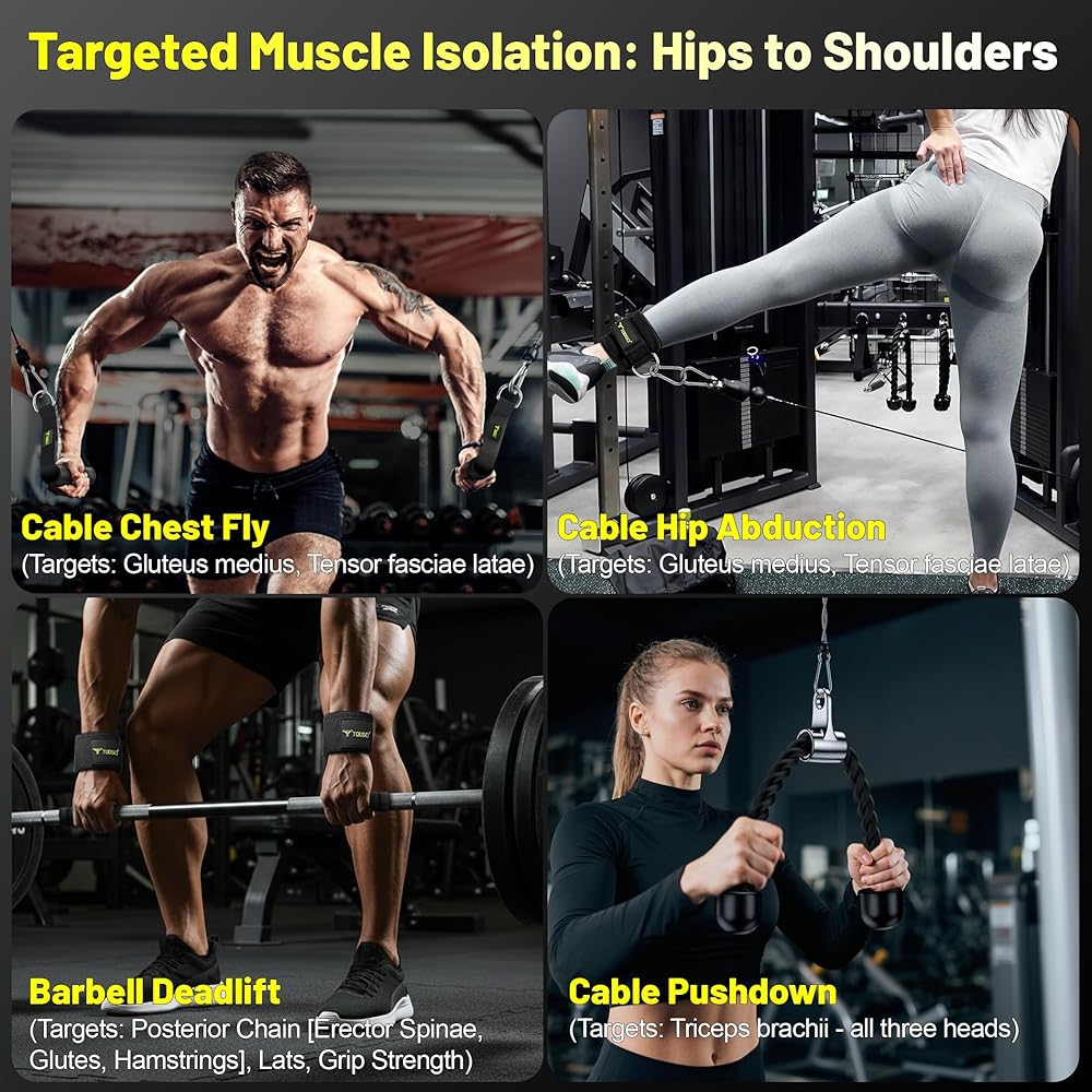Versatile Exercises & Home Gym Use — This set supports lat pulldown, triceps press-down, upright rows, cable curls, seated rows and other cable machine workouts. Intended for gym accessories for men and women and for use as cable machine home gym equipment, squat rack accessory, or general gym attachments for cable machine routines.