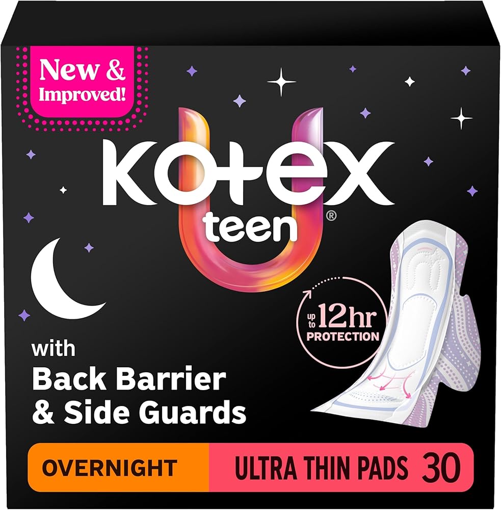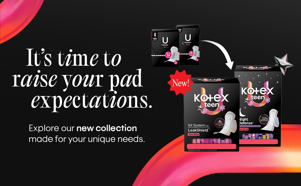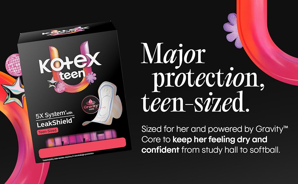 Make powerful protection and comfort a part of your period routine with Kotex Teen Ultra Thin Period Pads. Uniquely sized and designed for teens, these teen pads help eliminate gaps to prevent leaks* and offer up to 100% leak free comfort so that you can better focus on your day and not your period. The 5x System with LeakShield Protection has breathability, odor control, dryness, fit and leakage protection for up to 100% Leak Free Comfort. These period pads are designed for perfect fit and combine LeakShield Technology, a breathable top layer, a new Gravity Core and odor control to give you a menstrual pad that protects you in more ways than one. To help keep you feeling clean and fresh throughout your day, each feminine pad is designed with a Gravity Core that pulls period blood to the bottom of the pad. Each pad for teens is made with skin health in mind, which is why these pads are made without fragrance and free of elemental chlorine. For overnight protection in any sleep position, check out Kotex Teen Ultra Thin Overnight Pads. Kotex feminine products are FSA/HSA/HRA-eligible in the US. Packaging may vary from images shown. (*22% shorter vs Kotex Heavy UltraThin Pad)