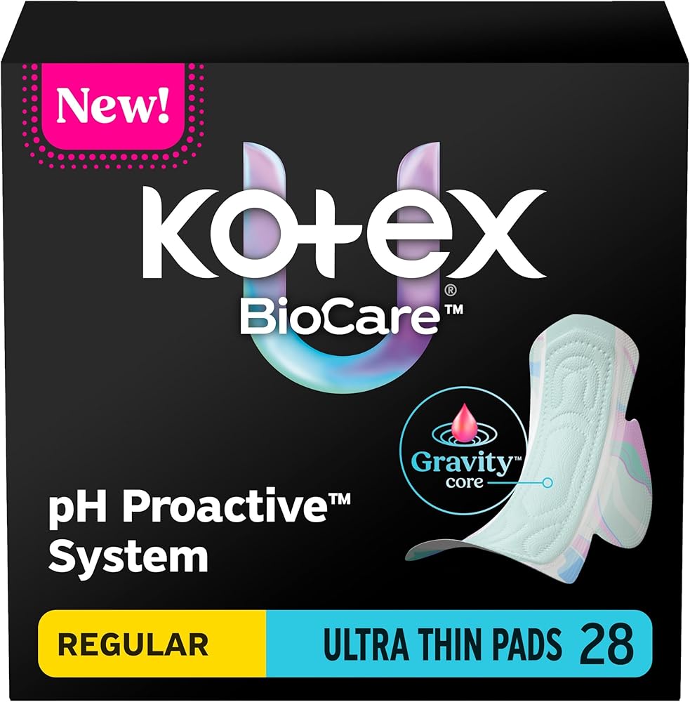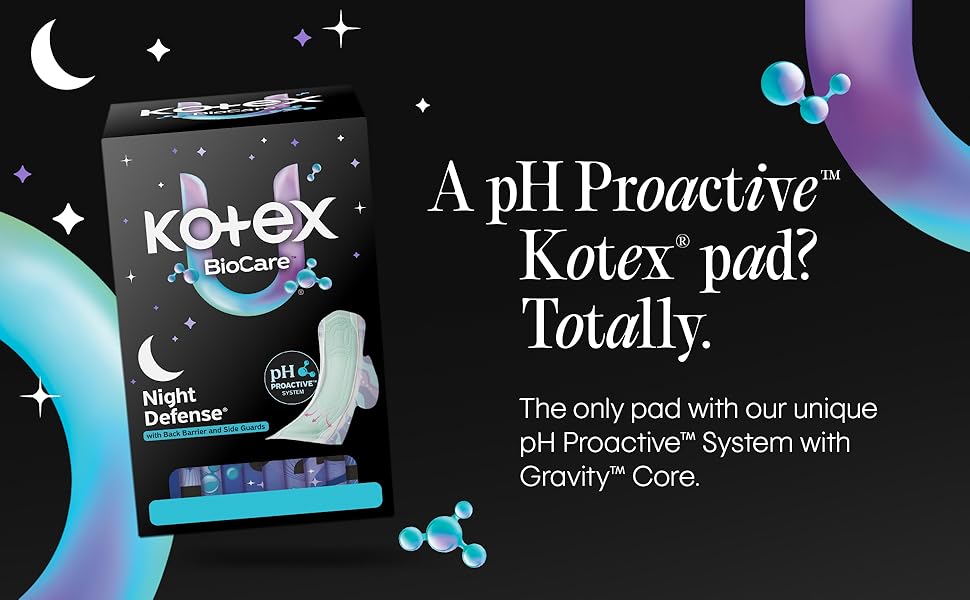 Nighttime period care is self care, which is why Kotex BioCare Ultra Thin Overnight Pads with Wings feature a pH Proactive System to help optimize your pad's pH. These pads help defend against odor and irritants* so you feel clean and fresh when you wake up. With up to 12 hours of Night Defense, a raised back barrier, and side guards, you're protected from leaks no matter how you sleep. The 5x System with LeakShield Protection delivers breathability, odor control, dryness, fit, and leakage protection for up to 100% Leak Free Comfort. Gravity Core technology pulls blood to the bottom of the pad to help keep you clean and dry throughout the night. BioCare sanitary pads are made without fragrance and are elemental chlorine free. Each pad is individually folded and wrapped for easy access, even on-the-go. For daytime protection, try Kotex BioCare Ultra Thin Pads with Wings. Kotex feminine pads are FSA/HSA/HRA-eligible in the US. Packaging may vary from images shown. (*from period blood)