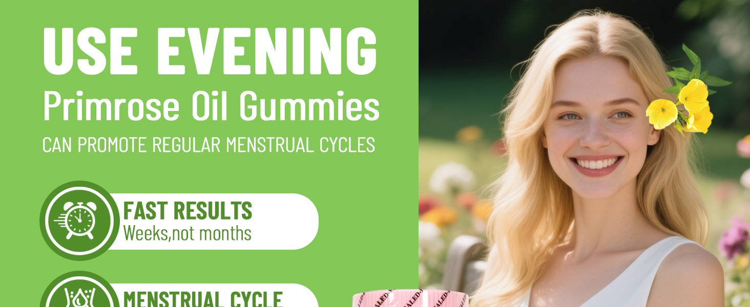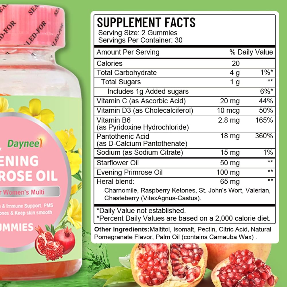 POMEGRANATE FLAVOR - These evening primrose oil gummies have a fruity flavor everyone loves, they ara pleasant and easy to chew, a daily essential for women, 3g*60 vegan gummies, 30 days supply*