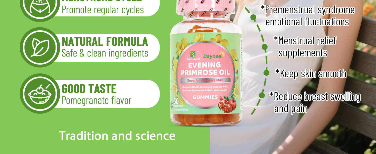 SUPPORT WOMEN'S HEALTH - Wins Town evening primrose oil gummies is a PMS mood swing & period relief supplement, it helps keep skin smooth, reduce breast tenderness & regulates mood swings by actively balancing hormones*