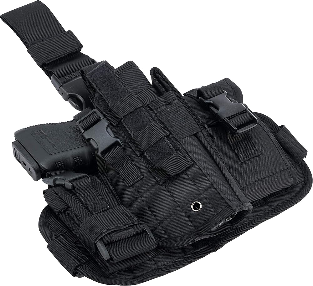 The Matrix Drop Leg MOLLE platform is a versatile tactical solution completed with a modular universal holster with integrated mag pouch, a mag pouch and a small accessory / hand-cuff sized pouch. Other feature includes non-slip strap, adjustable buckles, quick draw ready and much more. Universally fitting most pistol framed equipment, the Matrix Drop Leg system will provide Belt, Drop Leg, and MOLLE mounting holster to meet all your critical Airsoft Event Gaming needs.