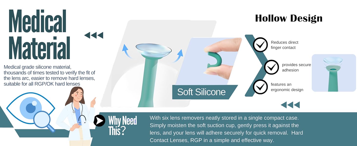 **آمنة وصحية لعينيك** - مصممة خصيصًا للعدسات اللاصقة الصلبة وRGP (غير متوافقة مع العدسات الناعمة). مصنوعة من سيليكون مرن صالح للطعام ولطيف على عينيك. نصيحة: تجنب الضغط بشدة على العدسة أو مباشرة على مقلة العين، المس مركز العدسة بلطف واسحبه ببطء لإزالة سلسة وغير مؤلمة.
