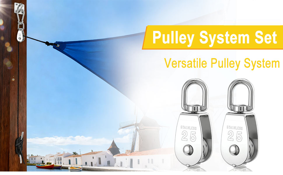 【Heavy Duty M25 Single Pulley Blocks, 360° Rotation】: M25 Cable Pulley Block, made of stainless steel, is designed for light-duty lifting, suspension, and towing applications. It offers corrosion resistance, maintenance-free operation. Built-in ball bearings and 360-degree swivel function, this single pulley block ensures tangle-free, flexible movement and prevents rope twisting. Maximum load capacity per pulley assembly is about 150KG / 330LB.