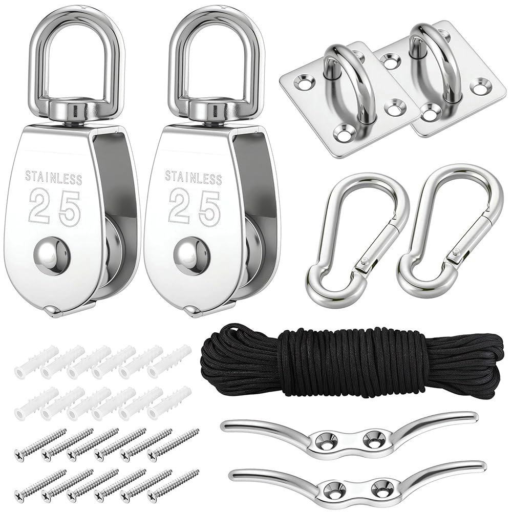 【Package】: Mornajina M25 Cable Pulley System Kit come with 7 kinds of Accessories, including stainless steel M25 Single Pulley Blocks x 2pcs, durable 66FT Nylon Rope x 1, Snap Hooks x 2, Eye Pad Plates x 2, Rope Cleat Hooks x 2, Screws x 12, Plastic Concrete Wall Anchors x 12. Our Stainless Steel Pulley System Kit is anti-rust and wear resistance with strong structure, very durable and safe.