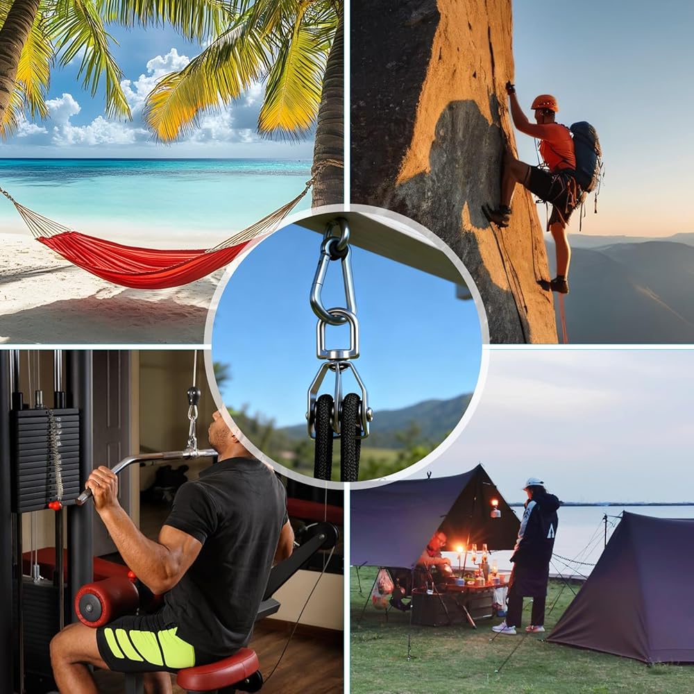 Easy to Use: The pulleys feature a swivel mechanism for smooth 360-degree rotation, effectively preventing rope tangles. They are easy to install and swivel after connection, improving work efficiency