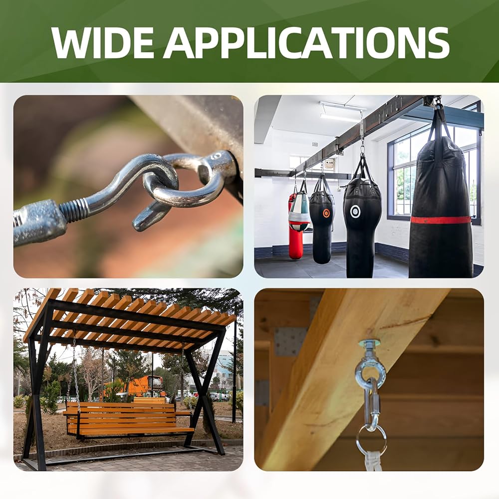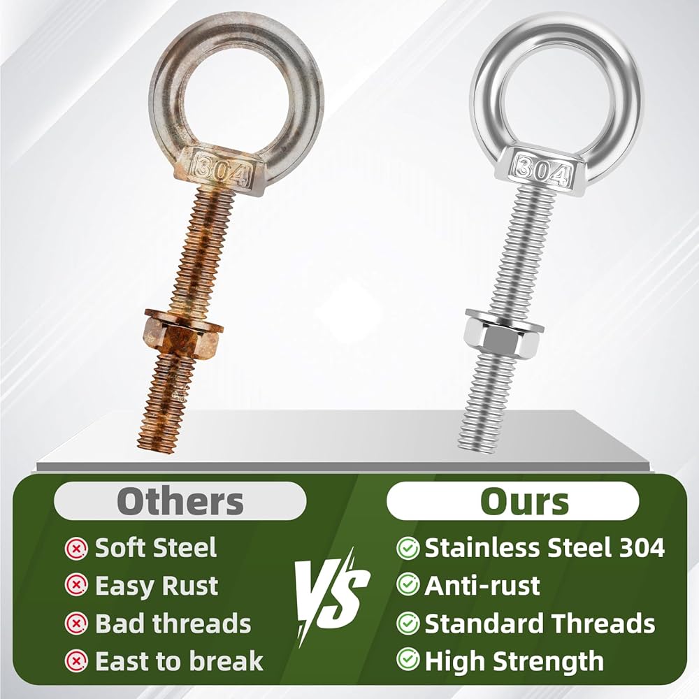 • Wide Application - The eye bolt can be widely used truck bed, metal board, swing chair, hammock, carport, wooden board, Tire, swing chair and etc. Also used on clotheslines, fencing, string light hanging as a tie down loop, hanging curtains or decorations and so on.