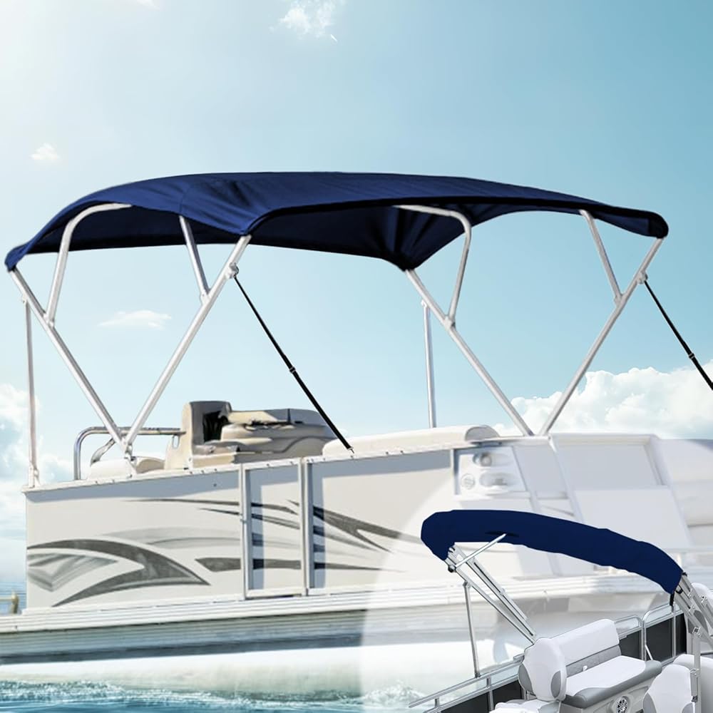 Bimini Top Cover 600D UV-Resistant Canvas, Tear & Fade Proof, Waterproof 4 Bow Boat Shade with Zippered Pockets, Pontoon Bimini Top with Frame Rustproof Square Poles, Navy 4 Bow 8'L 54" H 91"-96" W