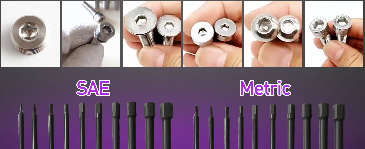 【Wide Compatibility】Suitable for car maintenance, engines, motorcycles, computers, toys, household appliances and furniture assembly. This 4" allen key bits (metric and imperial) comprehensively covers most hex screw sizes encountered in repair work. Compatible with electric screwdrivers, manual screwdrivers, drills and other tools