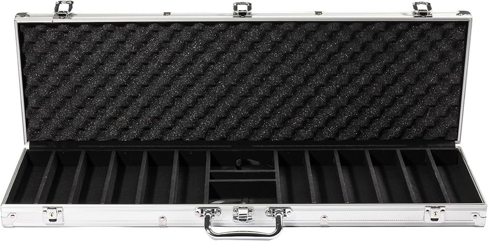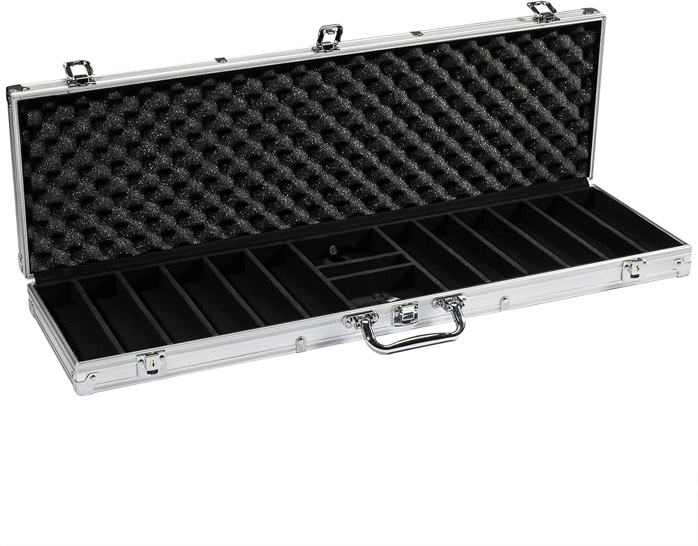 The 600-count aluminum case can hold up to 2 decks of your favorite cards and up to five game dice, and your accessories are easily retrieved with the included pull-tabs. For additional protection, the poker chip case locks with the included set of keys.