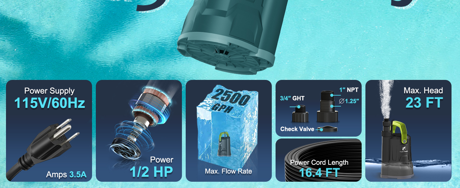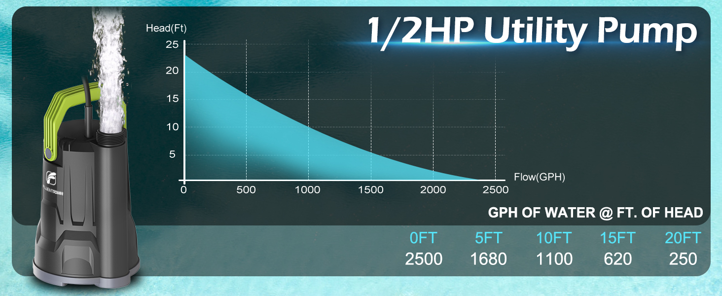 EFFICIENT DRAINAGE: 1/2 HP powerful motor offers a maximum flow rate of 2,500 GPH with 1-1/4" discharge hose horizontally. This sump pump has the ability to lift water up to Max. 23 feet of vertical height. Removing water to 2/5" of the surface.