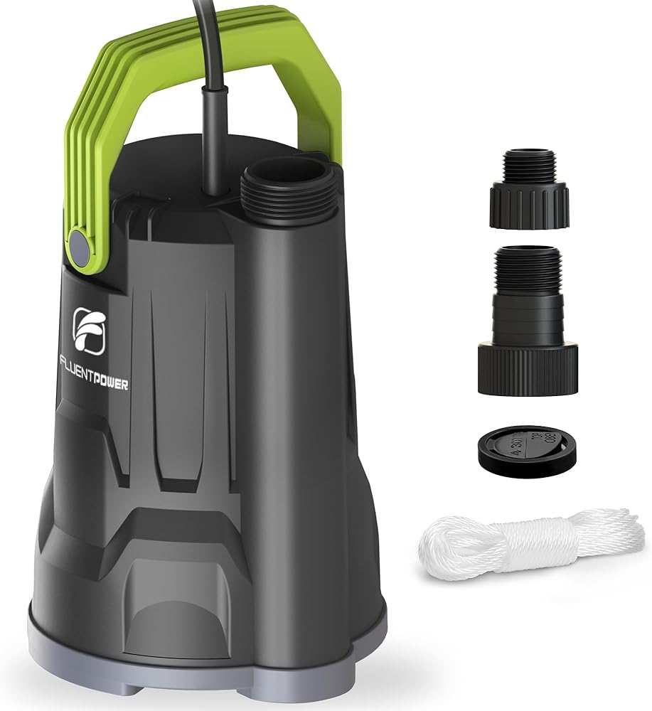 COMPACT & LIGHTWEIGHT: The portable handle design, along with a 16.4' power cable and a 26' rope, makes the submersible water pump easy to carry and install. This water pump can be used in a minimum 9"x9" pit. Handle up to 1/5″solids, ideal for water tank, garden pond, hot tub, swimming pool, and flooded basement window wells.