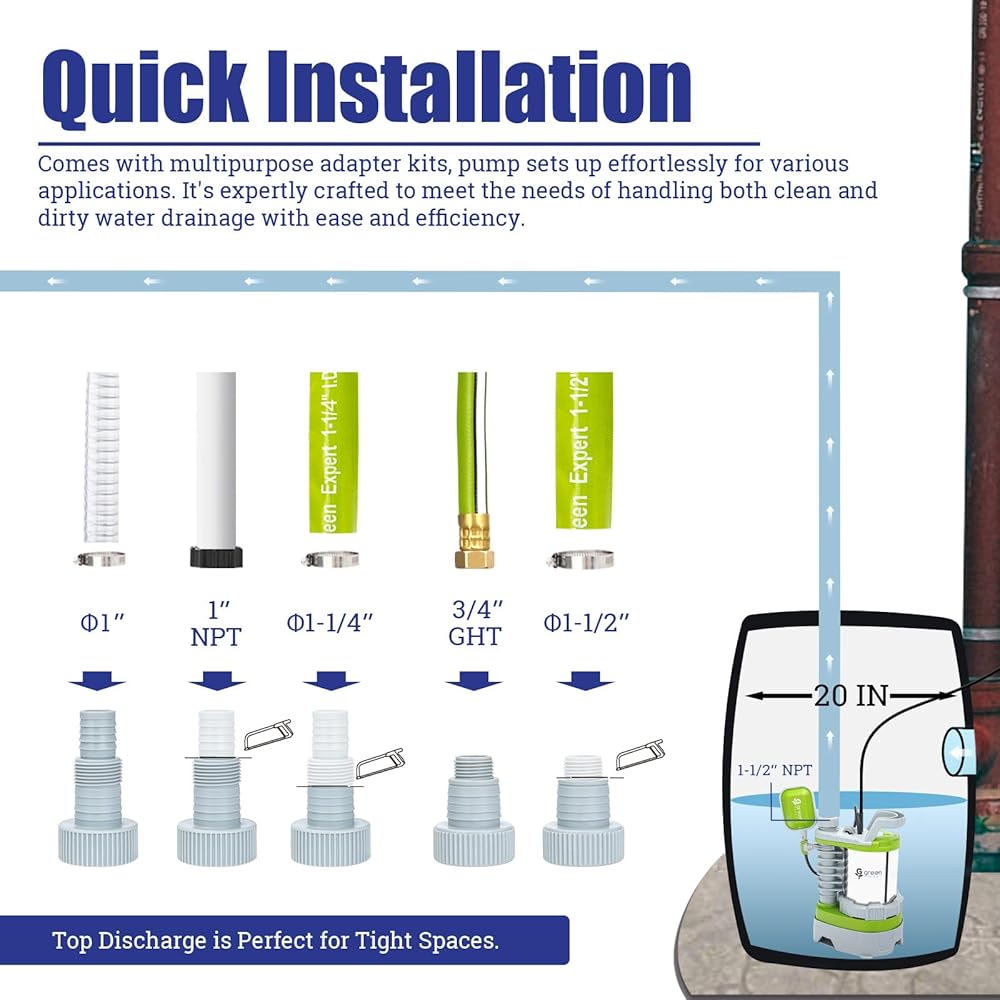 EASY SETUP + ADAPTER KIT + DURABLE BUILD – Includes multi-size hose adapters: 1", 1-1/4", 1-1/2" barbed, plus 3/4" GHT and 1-1/2" NPT outlet options. Corrosion-resistant thermoplastic with reinforced stainless casing and integrated top discharge for compact setup. And a 25 ft power cord for flexible placement. Not compatible with expandable hoses.