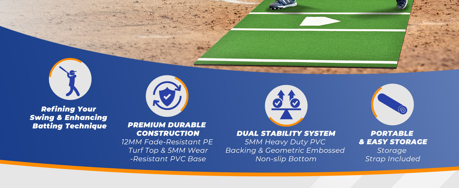 DUAL STABILITY SYSTEM FOR OUTDOOR & INDOOR USE: This baseball batting mat features extra-thick 5mm PVC bottom with a geometric anti-slip texture that grips the ground securely. This ensures the batter's box stays firmly in place during powerful swings, allowing you to focus entirely on your hitting technique. Perfect for outdoor, batting cages, backyards, or indoor training facilities.