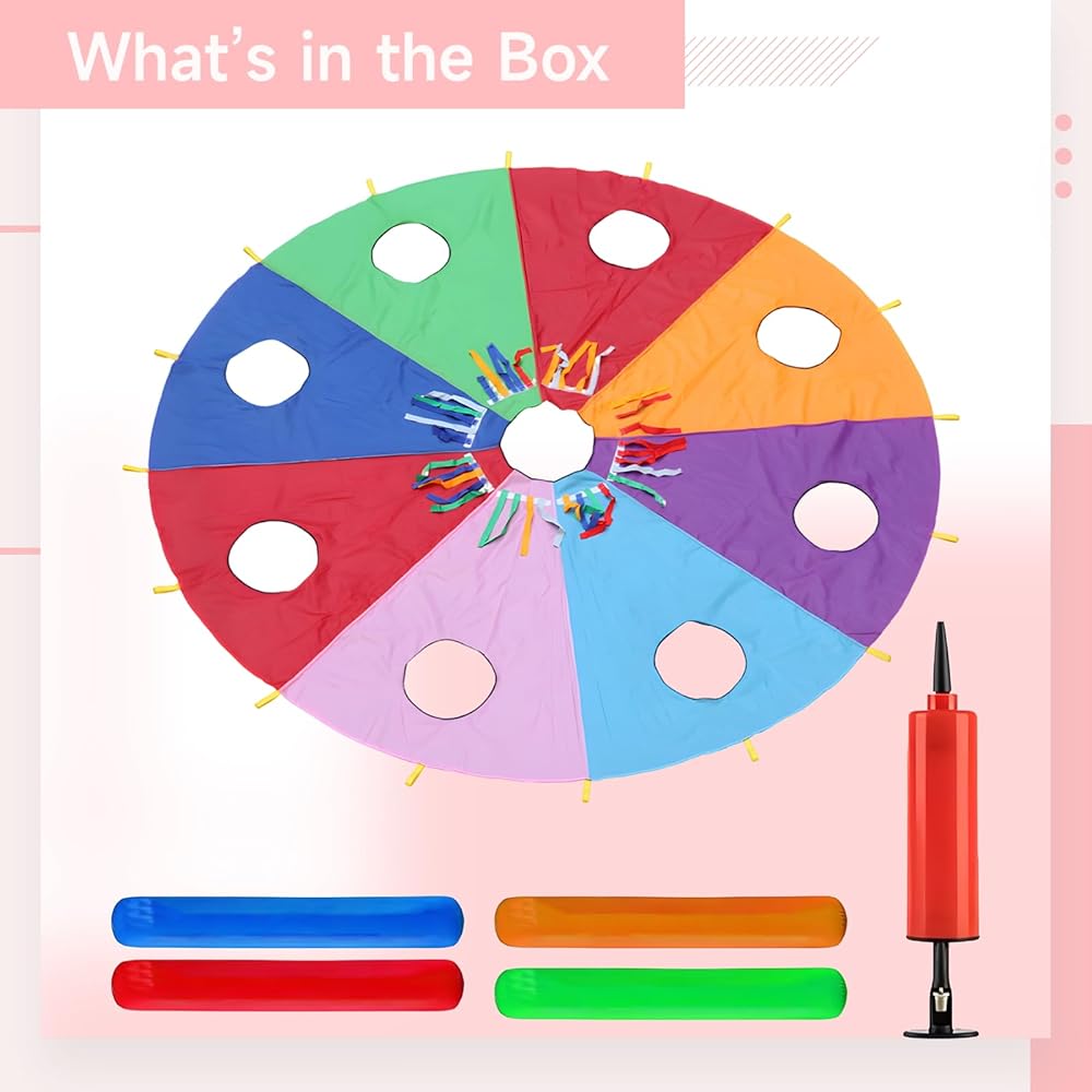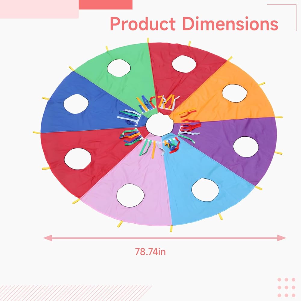 Color: Multicolor Material: Polyester Size: Rainbow Parachute: 78.7 x 78.7 x 0.08 in / 200 x 200 x 0.2 cm Package Includes: 1 x Rainbow Parachute,4 x Air Rods,1 x Inflator Note: - Please refer to the measurement. Tiny measuring error is allowable in normal range. - There might be a little color difference due to the monitor, camera or other factors, please refer to the physical item.