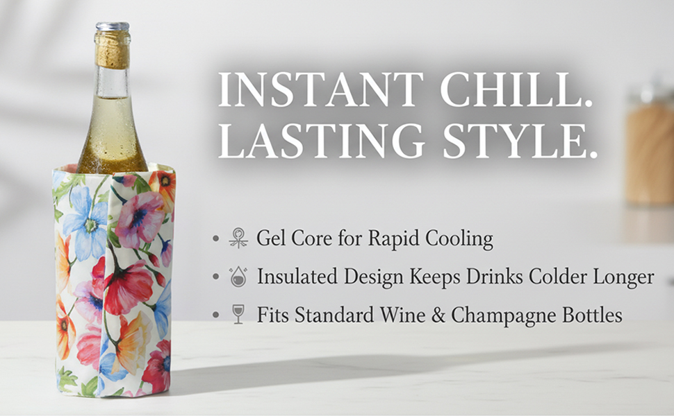 INSTANT & SUSTAINED CHILLING: Our advanced gel-cooled bracket rapidly chills your wine bottle in minutes and maintains its optimal cold temperature for hours. Simply freeze and enjoy refreshingly crisp red, white, Champagne, or sparkling wine without the need for ice.