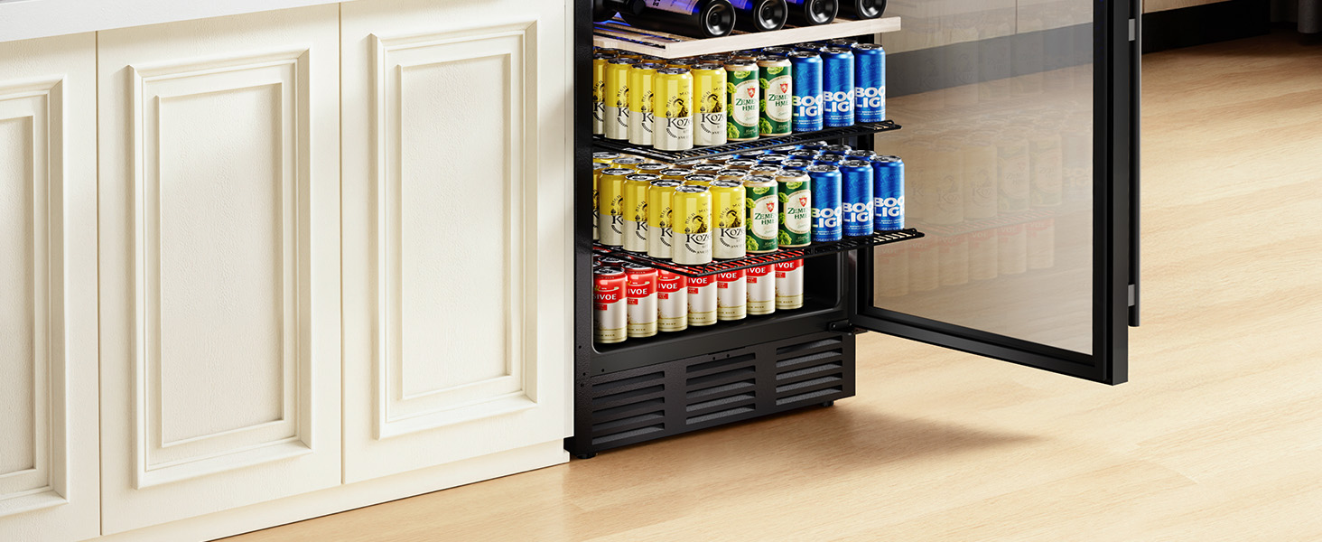 Built-In Design: This wine and beverage refrigerator features front ventilation that requires no side space for flexible installation. Its compact design (22.6"D x 22.4"W x 34.3"H) allows it to function as a built-in or under counter fridge in your kitchen or bar, as well as a freestanding fridge.