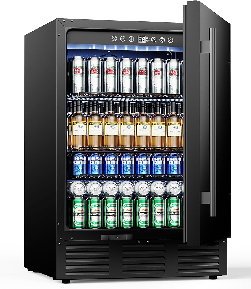 Efficient Cooling & Precise Control: The drink refrigerator offers a temperature control range of 37-65°F. You can chill beer and soda to perfection or keep wine and spirits at optimal storage temperature effortlessly. Furthermore, this bar fridge features an internal fan for even air circulation, ensuring maximum preservation of the flavor of each beverage.