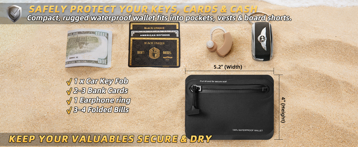 - Airtight Waterproof Protection: Industrial-grade airtight zipper keeps cards, cash, and keys completely dry, even when fully submerged