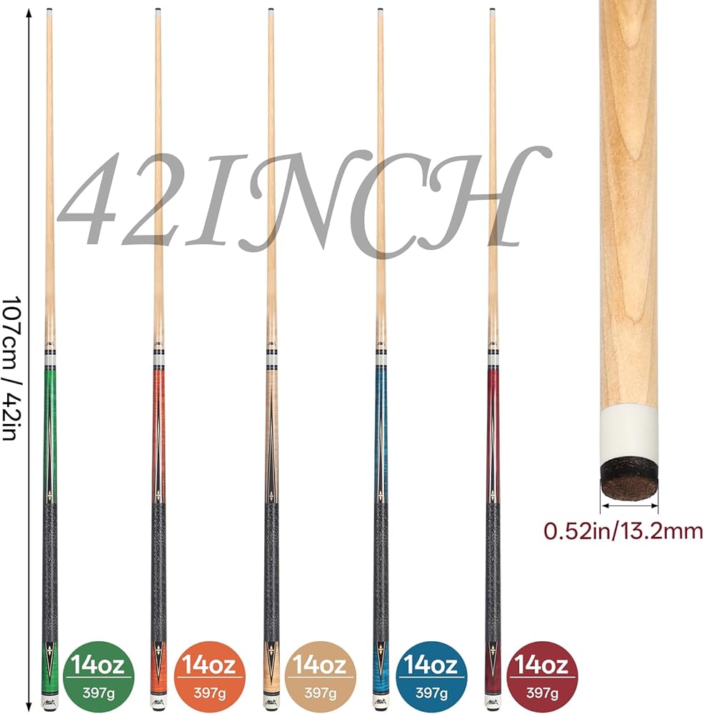 AKLOT Pool Cue Sticks, 42" Canadian Maple Professional Billiard Sticks, Taco De Billar Super Straightened Up 2-Piece Queue for Home, Pool Cues Set of 5, 14oz Multiple Colors