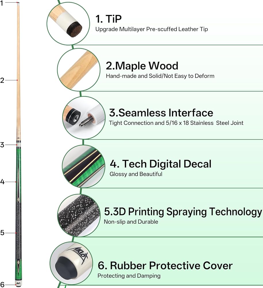 Professional Taper Design:Engineered taper in this pool stick set stabilizes shots, maximizes power transfer, and releases energy efficiently for pinpoint ball control and spin mastery