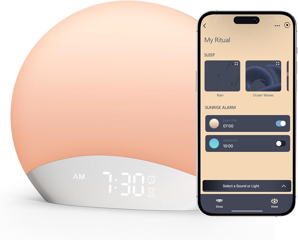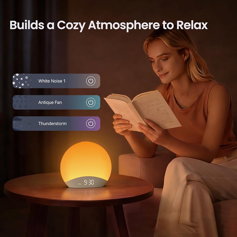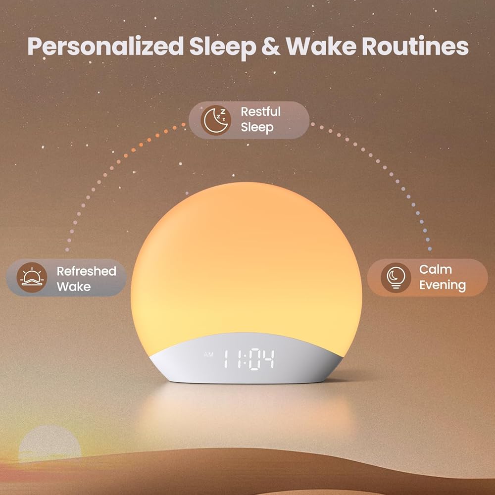 𝐂𝐮𝐬𝐭𝐨𝐦𝐢𝐳𝐞 𝐘𝐨𝐮𝐫 𝐖𝐚𝐤𝐞: Break away from the traditional orange glow, choose from 8 sunrise colors to match your mood, making every morning unique. Its wake-up light sunrise simulation gradually brightens your room from 1% to 100% over 5–60 minutes, filling room with natural light and helping you wake refreshed without harsh alarms.