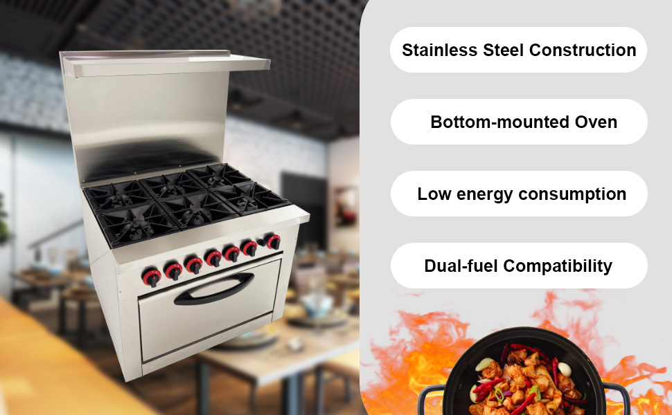 Premium Stainless Steel Construction: Crafted with high-quality stainless steel (body + oven interior), this commercial gas stove with oven offers excellent heat resistance and corrosion resistance—standing up to high-temperature cooking, oil splatters, and daily wear.