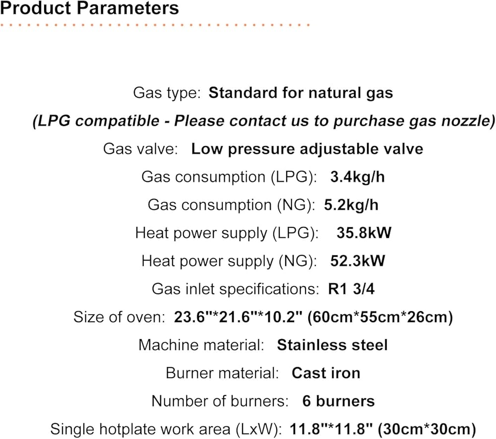 Natural Gas Standard : Designed with standard natural gas (NG) connection (matches 52.3kW total heat power), this 6 burner gas range is also compatible with LPG (liquefied petroleum gas) by replacing dedicated nozzles (sold separately).