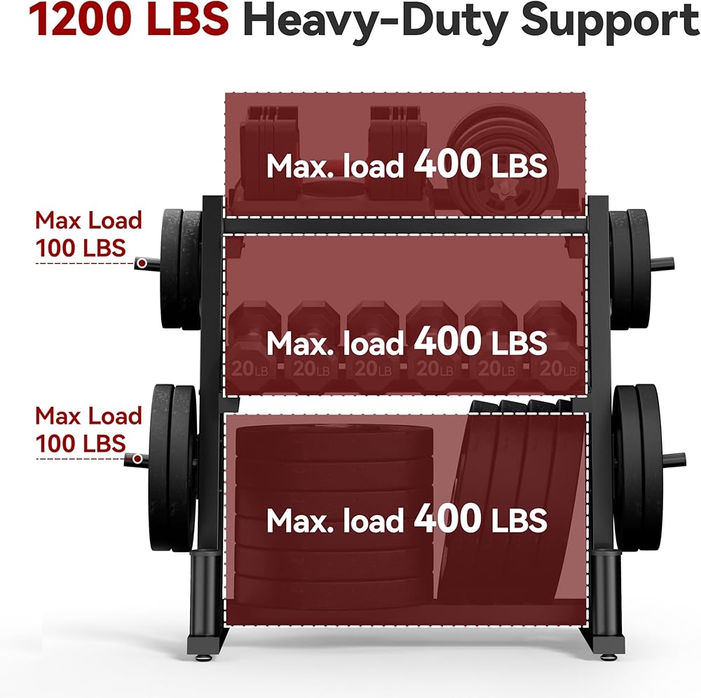 3-Tier Heavy-Duty Dumbbell and Plate Rack 1200LB Capacity, Adjustable Weight Storage Stand for Dumbbells, Kettlebells, Barbells & Weight Plates, Compact Multifunctional Organizer for Home Gym