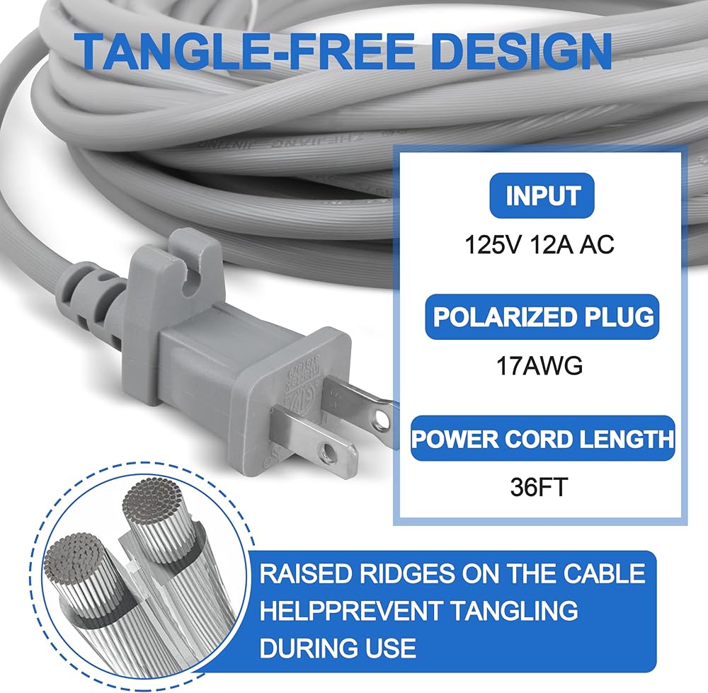 36FT length (5-10FT longer than original vacuum cords). 12A 125V AC input, 17AWG polarized plug. Clean large areas (living rooms, bedrooms) without repositioning the plug. Stable and safe to use