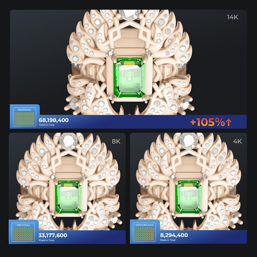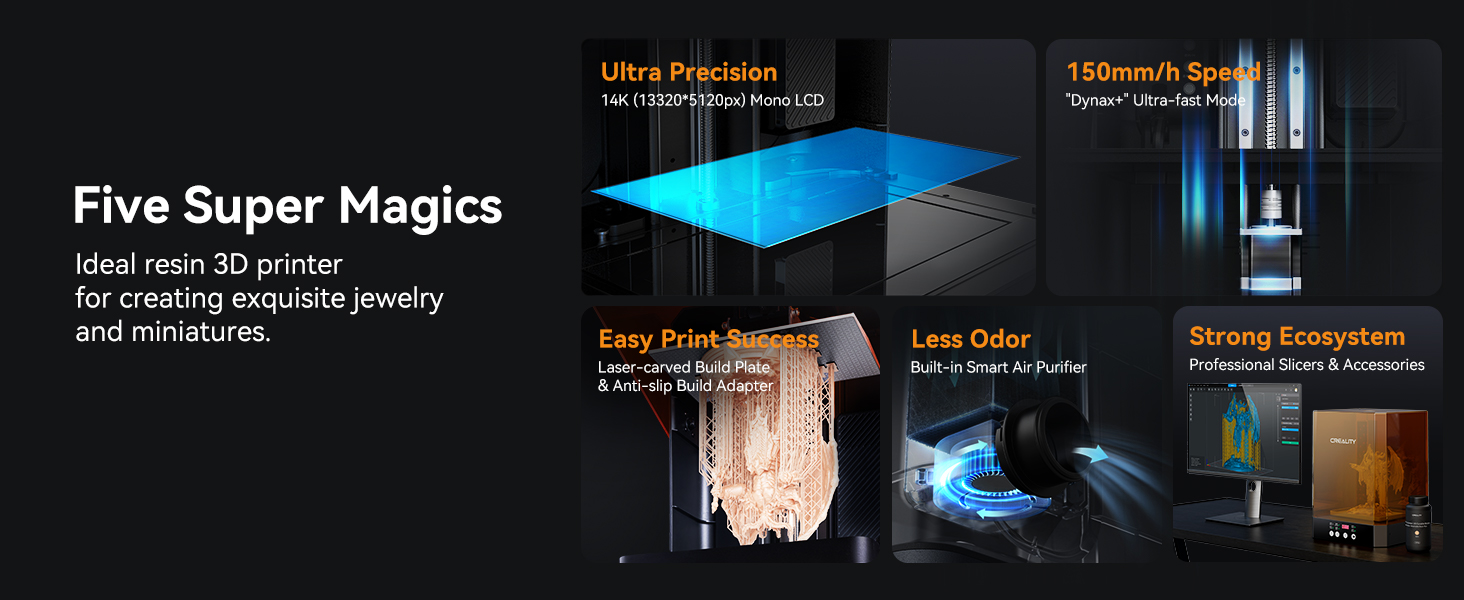 Stunning 14K, Utterly Exquisite: Our 14K Creality Resin 3D Printer equipped with a 13320*5120px(16.8*24.8um), vivifying all details of jewelry and miniatures. The sizable 10.1" display provides a spacious bigger print area and creations with great clarity and sharpness